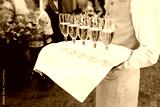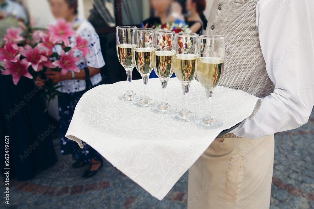 Elegant dressed waiter holding tray with champagne in glasses at wedding reception in luxury restaurant, catering concept