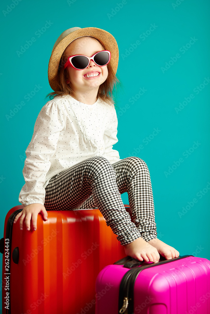 Little smiling girl in straw hat and sunglasses sitting on suitcases, portrait of beautiful child going on a journey, studio shot over isolated blue isolated.