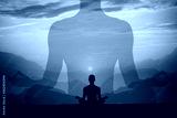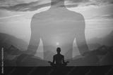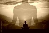 Man meditating yoga at sunset mountains. Travel Lifestyle relaxation concept. Double exposure shot