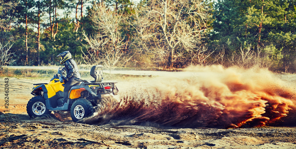 Teen riding ATV in sand dunes making a turn in the sand