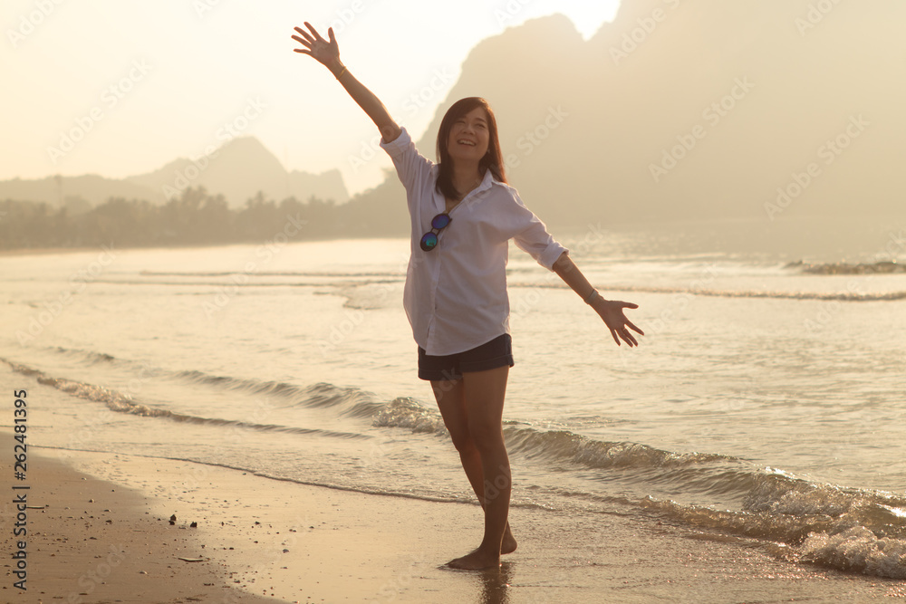 Freedom woman standing arms outstretched back and enjoy life on the beach