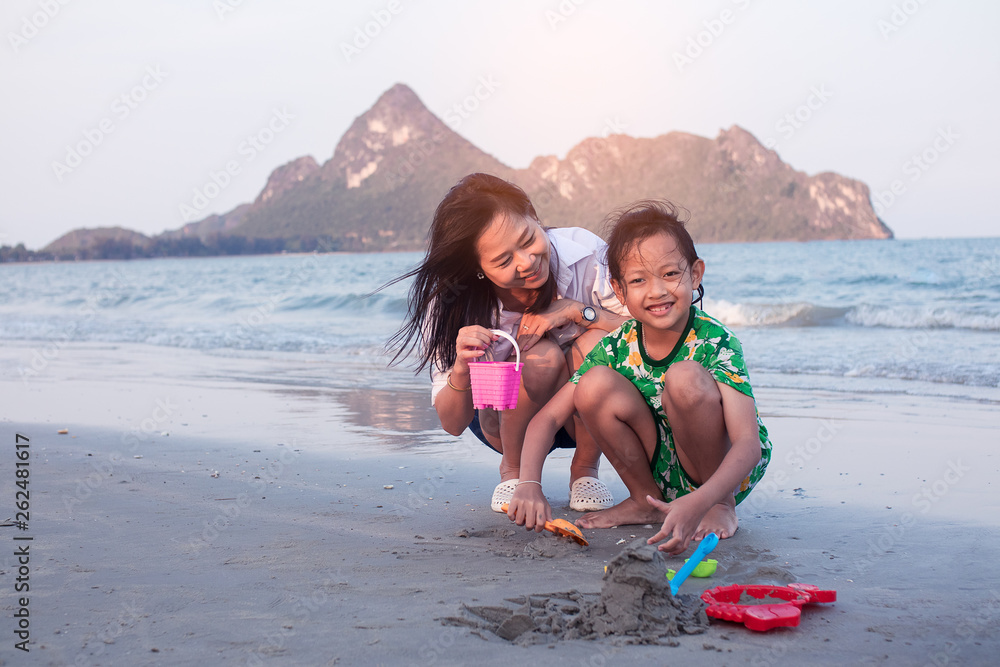 Asian Mother and daughter sitting on the beach and playing in the sand