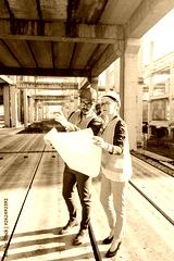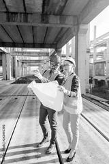 Two young architects or civil engineers visiting large construction site, looking at floor plans. Man is pointing into distance with his hand
