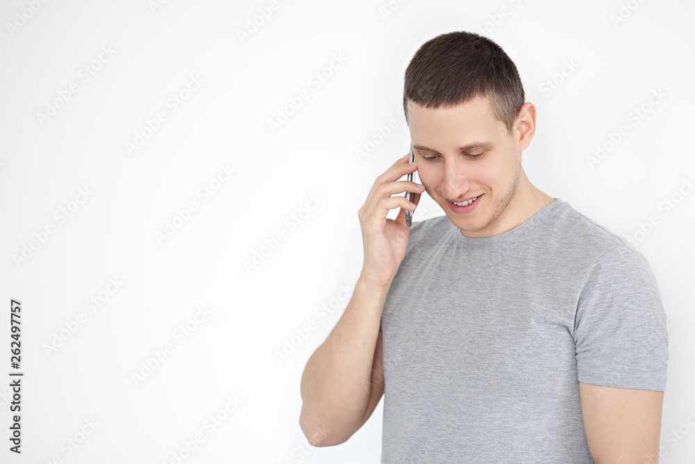 Portrait of a cheerful, positive, attractive guy with stubble in a gray T-shirt, talking on the phone on a gray background. Business negotiations. Portrait of cheerful man talking on the phone