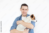 A smiling handsome man holding a purebred dog on a white background. The concept of people and animals. young man holding his dog in his arms with love and playing with him, against a white background