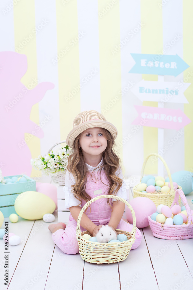 Easter concept! A girl is playing with an Easter bunny in a basket. Easter colorful decor in the studio. Fluffy rabbit in a basket with colorful painted eggs on the background of the Easter interior.
