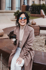 Beautiful young girl in coat and sunglasses sitting on the bench. Woman drinking coffee and laughing.