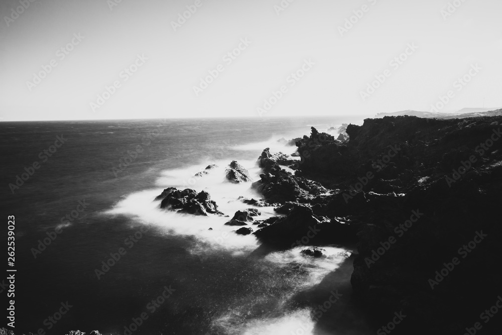 Black and white image of a seascape with mountains and rocks, long exposure and waves that become foam. Image for black and white backgrounds. Tenerife island wallpaper