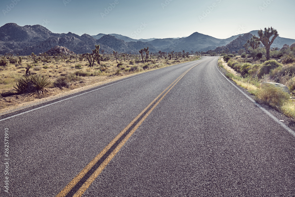 Vintage stylized picture of a desert road at sunset, front focus on asphalt, California, USA.