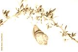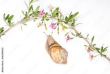 goji flowers and grape snail on white background top view
