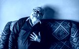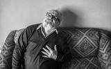 Old man with heart attack. Elderly senior man has chest pain. Unhappy man face in acute breast pain sitting on sofa at home, feel sick unwell. Sad aged man hand holding his heart. Heart attack symptom
