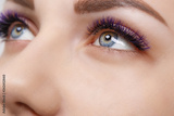 Eyelash Extension Procedure. Woman Eye with Long Blue Eyelashes. Ombre effect. Close up, selective focus.