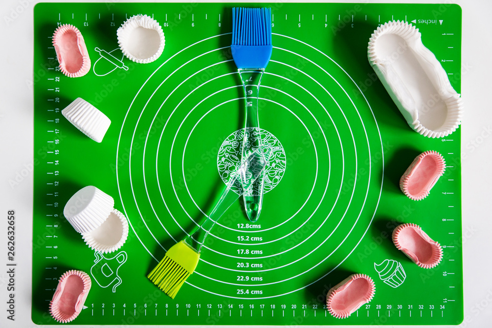 Flat lay of candy molds and kitchen equipment on a silicone mat