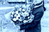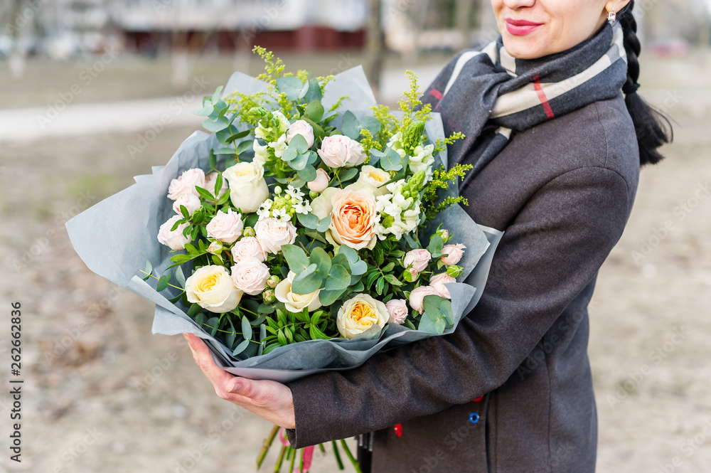 Woman holding a bouquet of beautiful and colorful flowers in hands. No face. Closeup photo
