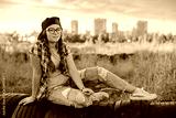 girl teenager in glasses sits the ground city background in the headphones of selfie smartphone