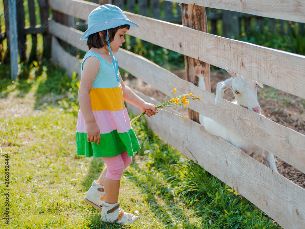 A little girl is feeding a goat on the lawn a sunny summer, in a country in Russia.