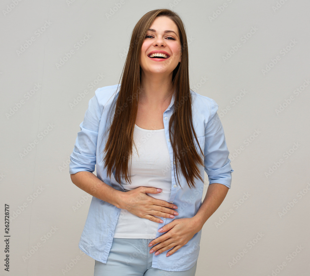 Happy woman holds hand on belly.