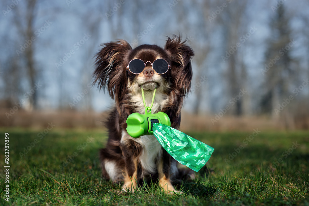 chihuahua dog in glasses holding poo bag in her mouth