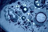composition with scales, wheat grain and coins