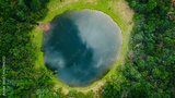 Aerial view of natural pond surrounded by pine trees in Fanal, Madeira island, Portugal
