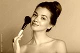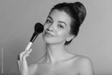 Closeup portrait of beautiful happy young girl with perfect skin is holding makeup brush in hand. Isolated on beige. Beauty and cosmetics concept.