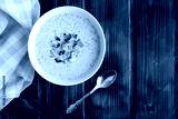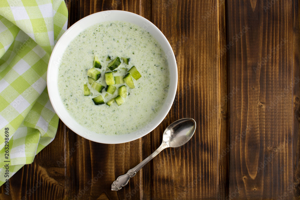 Yogurt smoothies with cucumber in the white bowl on the brown wooden background.Top view.Copy space.