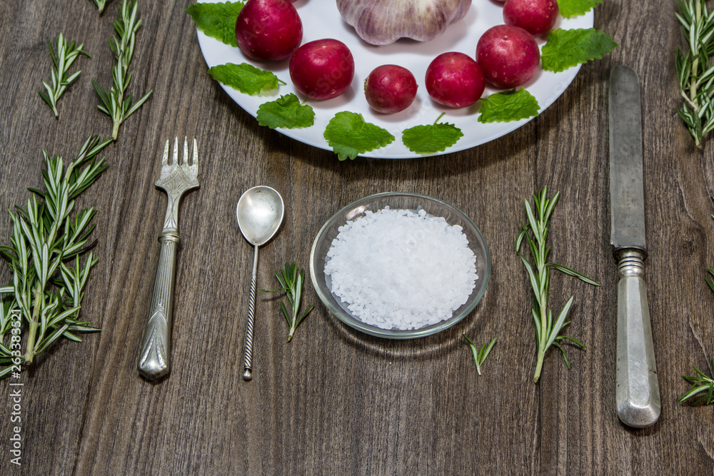composition with radishes, garlic, sea salt, rosemary, lemon balm, silver cutlery