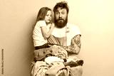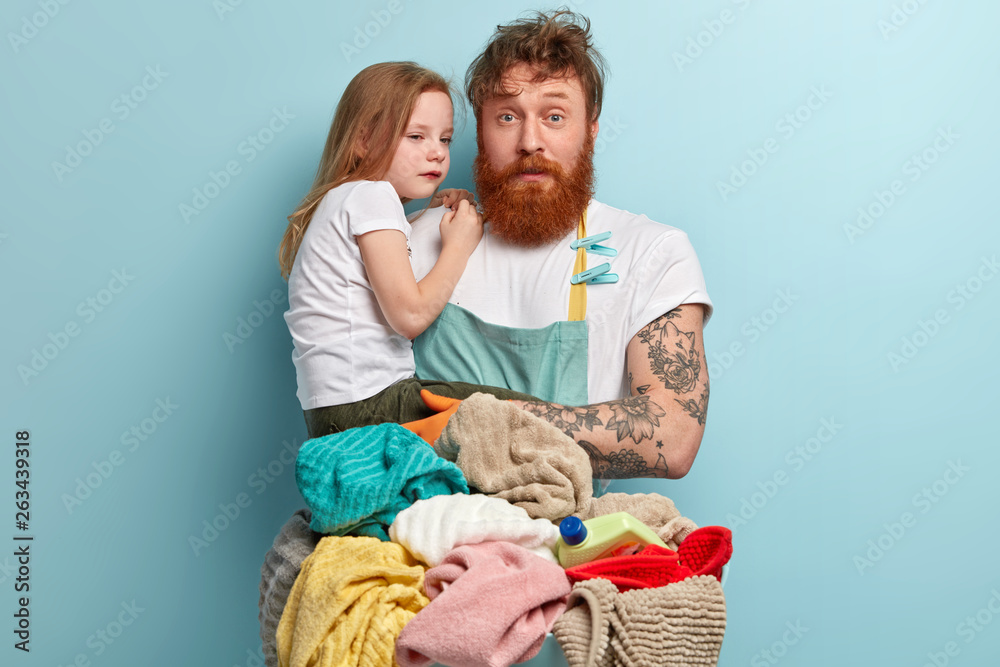 Busy foxy single dad tries to tease crying child, looks with puzzled expression, wears apron, washes laundry, has much domestic work, isolated over blue background. Fatherhood and business concept