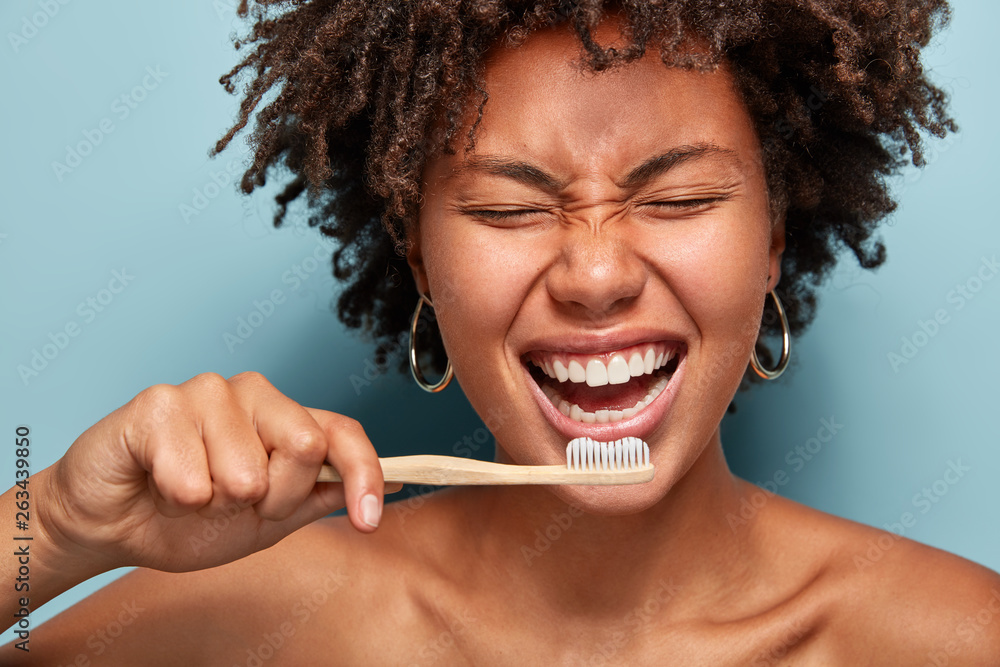 Cropped shot of cheerful glad dark skinned lady shows white teeth, has overjoyed expression, good mood in morning, prepares for dentist visit, stands with half naked body, isolated on blue wall
