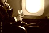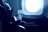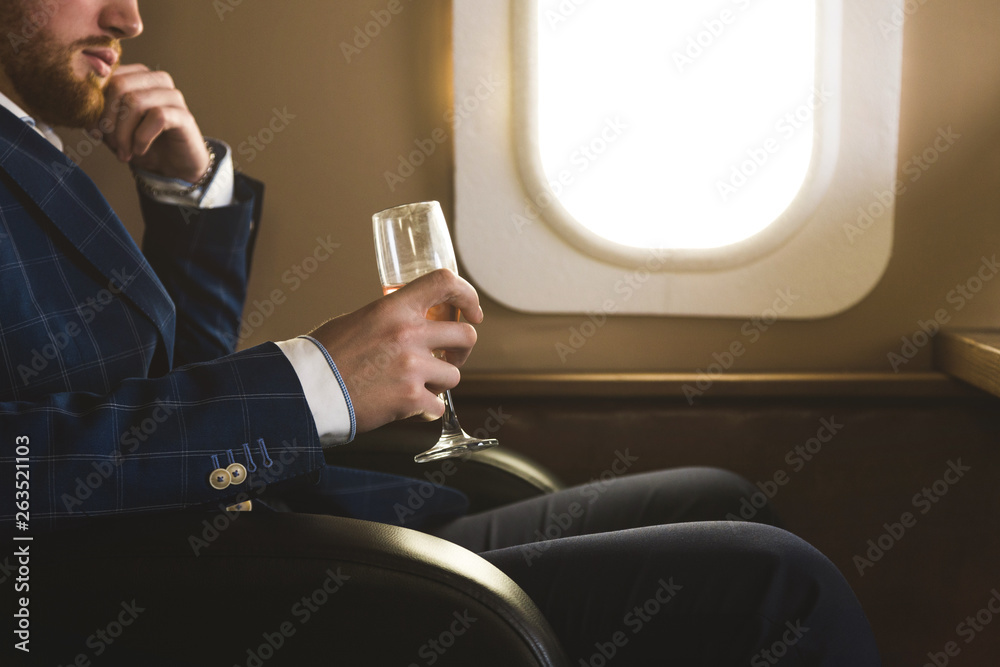 A young successful businessman in an expensive suit sits in the chair of a private jet with a glass of champagne in his hand and looks out the window