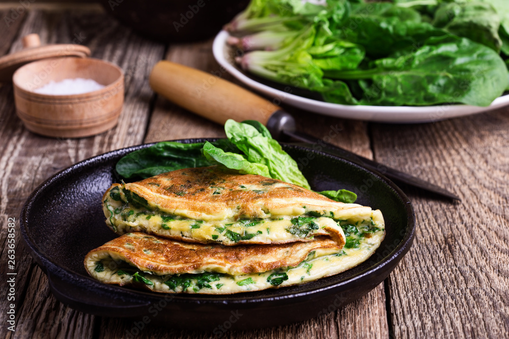 Spinach omelette in cast iron skillet, healthy vegetarian breakfast