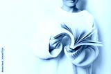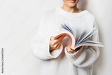 Close view of woman in white woolen sweater holding an open book with pink cover in hands. Mock up of Reading book concept background.