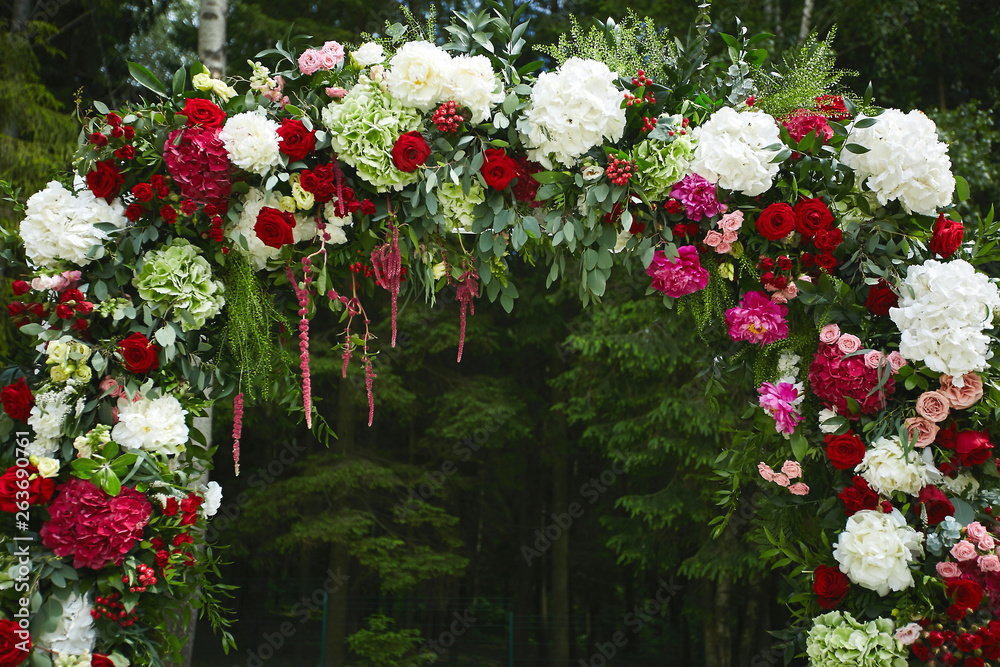 Round wedding floral arch from colorful fresh flowers outdoors before the wedding ceremony - wedding decoration