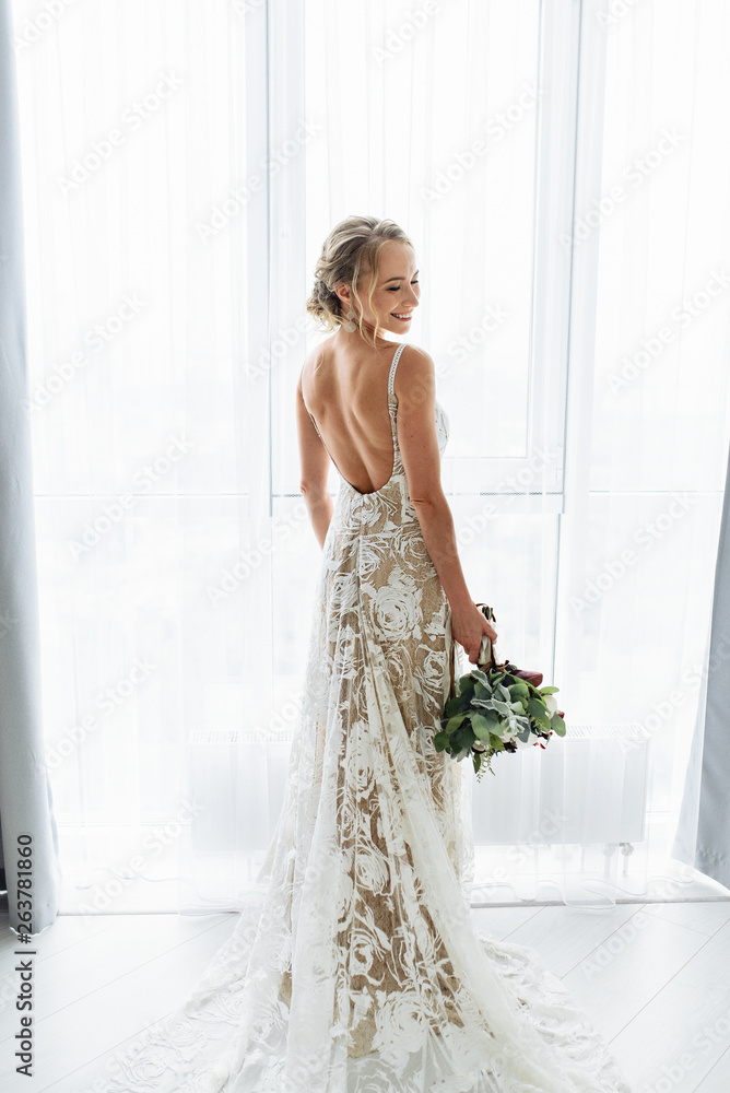 Awesome bride in a long wedding dress with a beautiful bouquet in hand and with charming smile