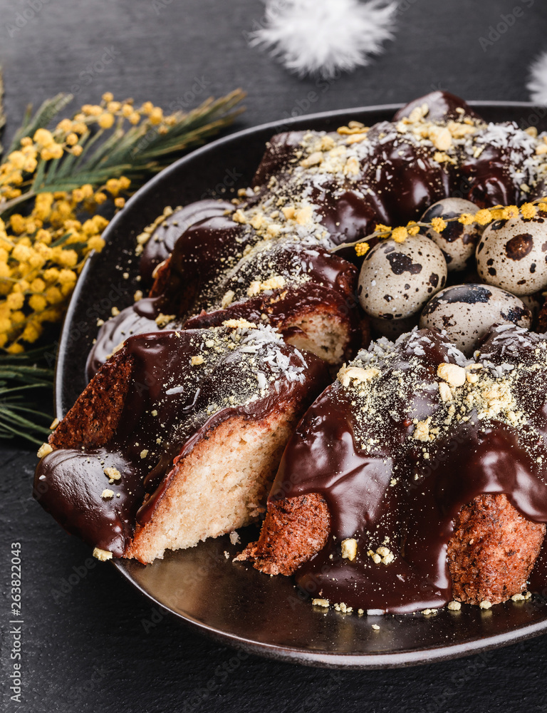 Easter cake with chocolate, coconut, spring flowers, quail eggs on a dark stone background. Happy Easter celebration