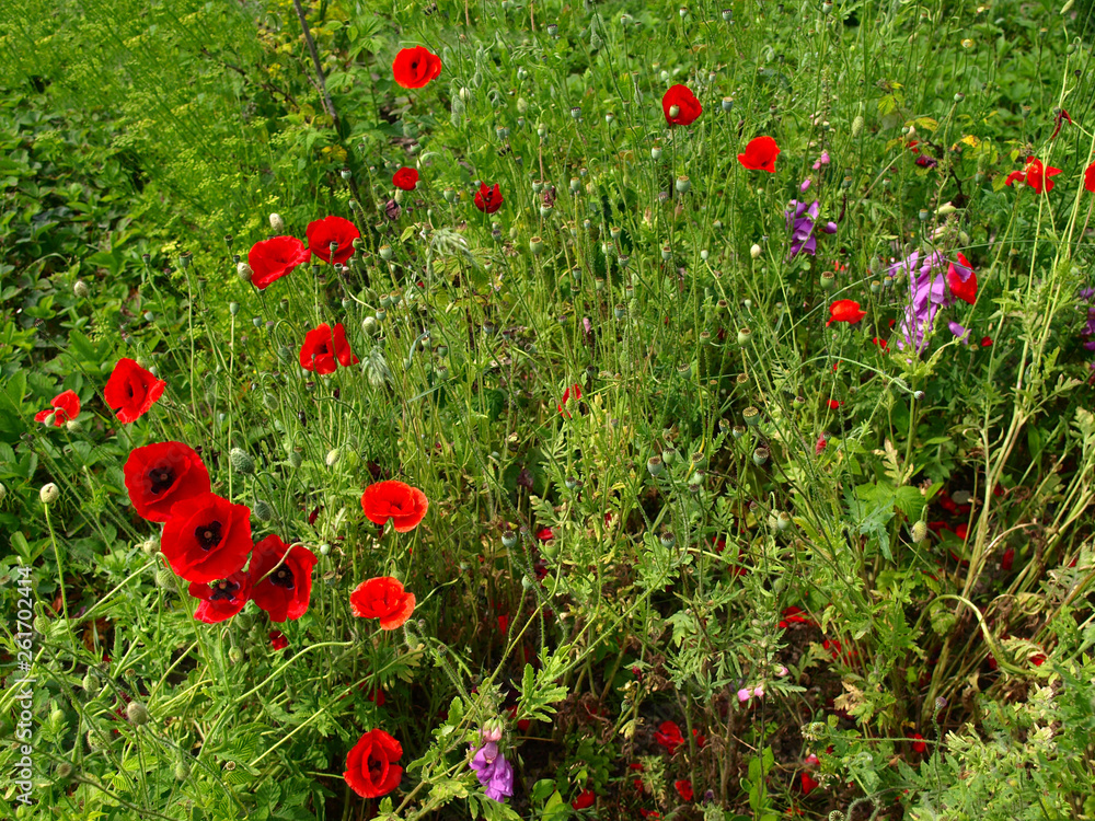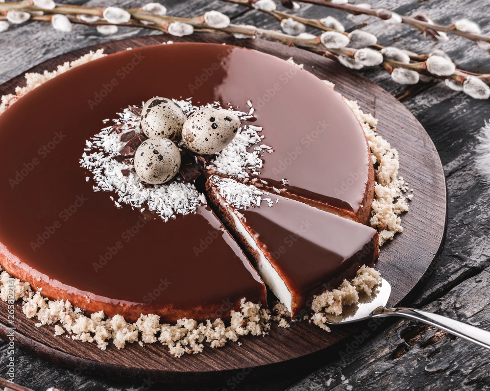 Easter cake with mirror glaze chocolate, coconut, spring flowers, quail eggs on rustic background. Happy Easter celebration. Top view, close up