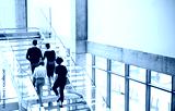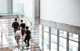 Rear view of group of young businesspeople walking up the stairs.