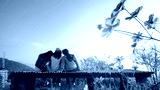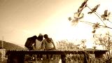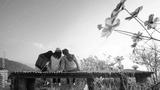 3 women friends sitting on a wooden seat, warmly close at the scenic landscape and beautiful flowers