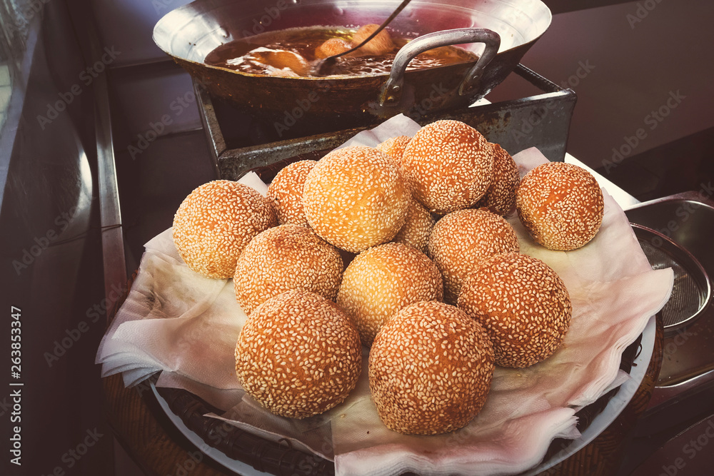 Traditional vietnam fried ball dessert bean selling in the street in Danang.