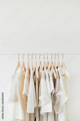 Feminine clothes on hanger. Minimal fashion composition on white background. Lifestyle concept.