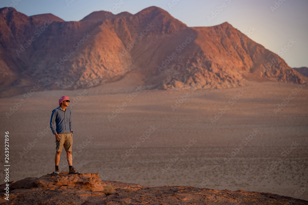 Young Asian man traveler standing on the rock in Wadi Rum desert looking at sunset, famous place in Jordan. Middle east travel concept