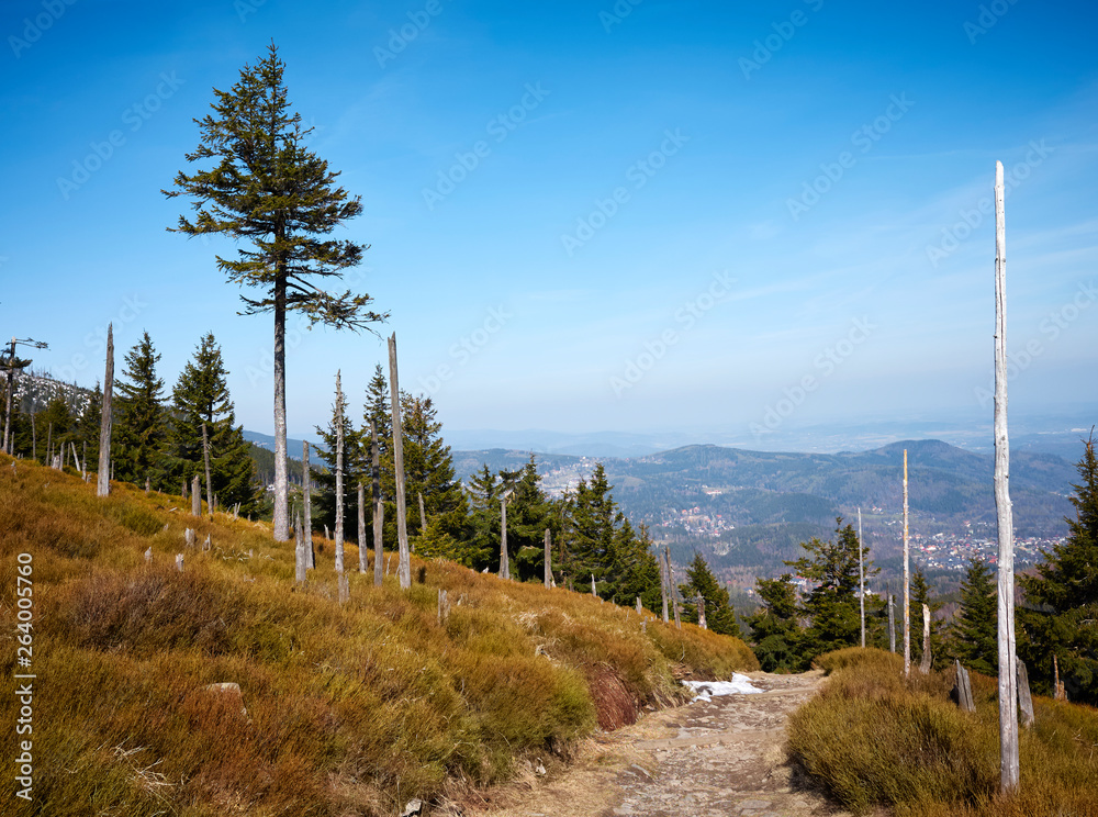 Hiking mountain path in a Karkonosze National Park in the spring, Poland.