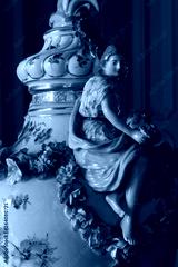 Close view of an antique ceramic decorative vase featuring a woman and garlands of flowers, vertical aspect