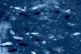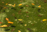 Leaves and algae in a shallow exterior garden pool in need of cleaning, horizontal aspect