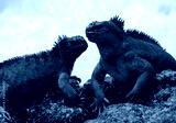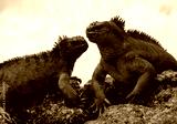 Marine iguanas are sitting on rocks. The Galapagos Islands. Pacific Ocean. Ecuador.