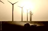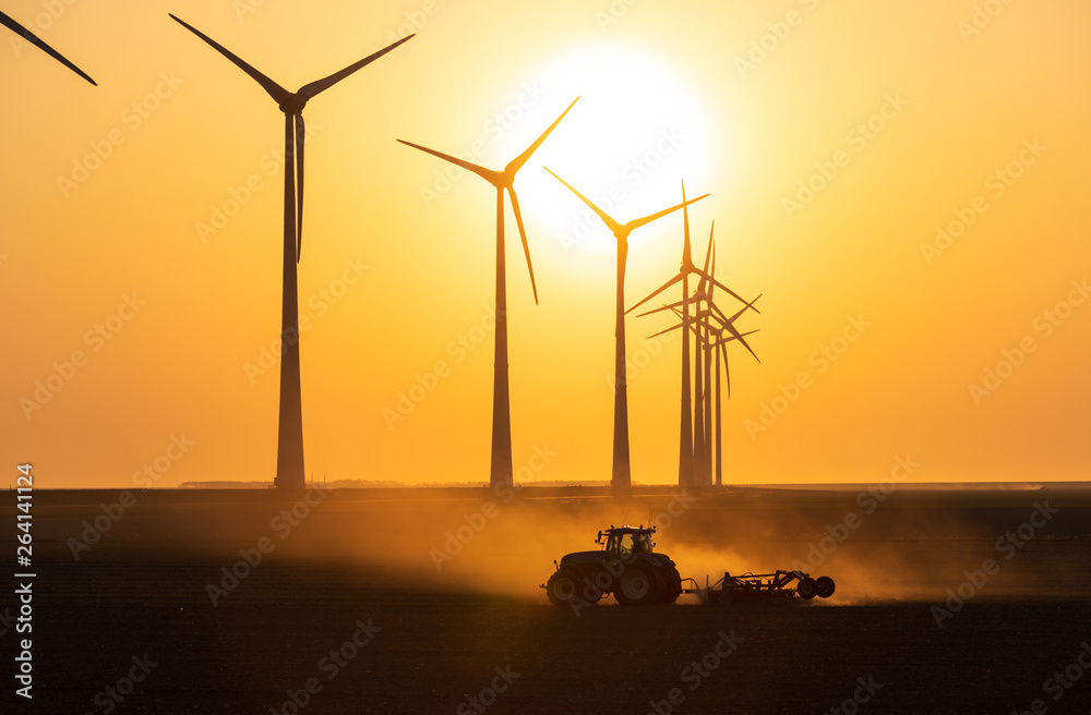 A tractor cultivating farmland during sunset at a row of windturbines. Groningen, Holland.