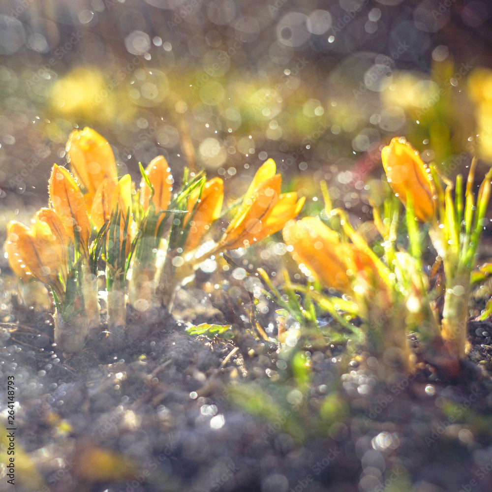 Spring background with Flowering yellow Crocus in Early Spring. Crocus Iridaceae . Iris family.