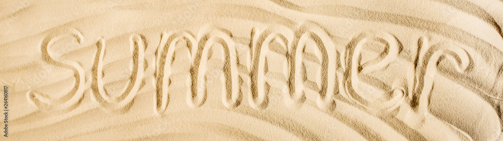 panoramic shot of word summer written on wavy sand