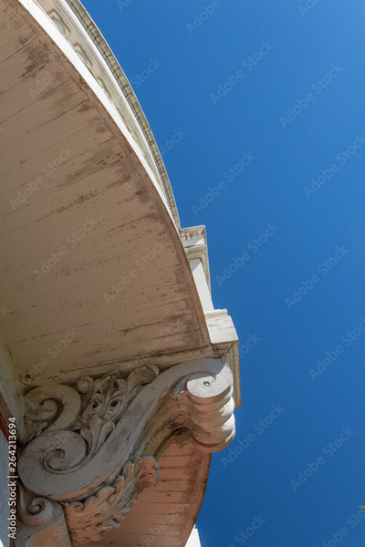 Exterior architecture curved balcony with carved corbel, blue sky copy space, vertical aspect
