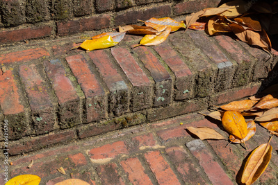 Very old brick steps covered in dirt and moss, leaf litter, horizontal aspect